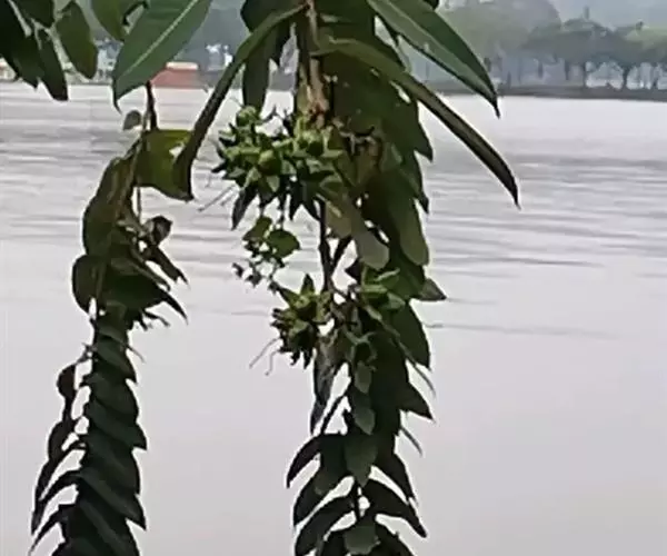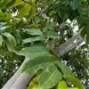 乔木;树皮褐灰色,有皱褶裂纹;板状根不甚发达;枝下垂,螺旋状或轮生于树干上,幼时具4棱。叶阔椭圆形、矩圆形或卵状矩圆形,长12-15厘米,宽5-7厘米,顶端短渐尖,基部深裂成心形,裂片圆形,中脉在上面下陷,在下面凸起,侧脉20-24对,粗壮,明显;叶柄长4-8毫米,粗厚,带红色。