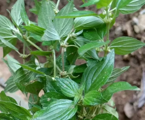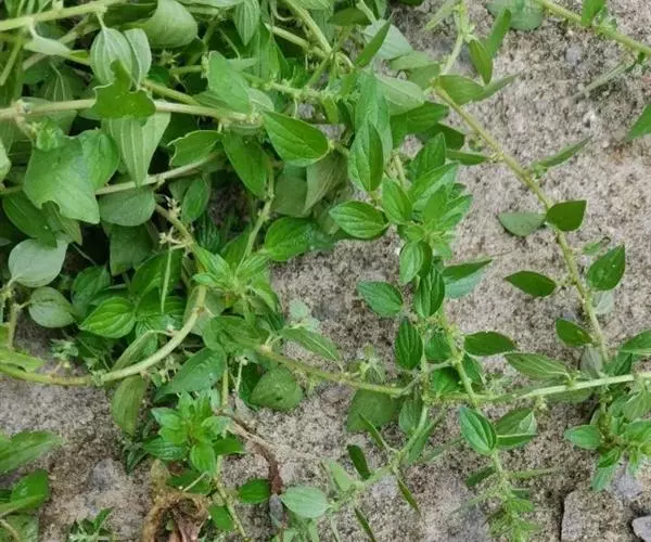 多年生草本;茎直立或渐升,高12-40厘米,不分枝,通常在基部或下部有1-3对对生的长分枝,枝条不分枝或有少数极短的分枝,有短伏毛,或混有开展的疏柔毛。叶全部对生,或茎顶部的对生;叶片草质,卵形或宽卵形,长1.2-3.8厘米,宽0.8-2.6厘米,短分枝的叶很小,长约6毫米,顶端短渐尖或微钝,基部圆形,边缘全缘,两面有疏伏毛,或有时下面的毛较密,侧脉1对;叶柄长0.3-1.6厘米。团伞花序通常两性,直径1-2.5毫米;苞片三角形,长2-3毫米,顶端骤尖,背面有毛。雄花有短梗:花被片4,狭长圆形或长圆状倒披针形,长约1.5毫米,基部稍合生,外面有疏毛;雄蕊4,长约1.8毫米,花药长约0.5毫米;退化雌蕊狭倒卵形,长约0.4毫米。雌花:花被椭圆形或近菱形,长约0.8毫米,顶端有2小齿,外面密被柔毛,果期呈菱状卵形,长约1.5毫米;柱头长1.2-2毫米。瘦果卵球形,长约1.2毫米,淡黄白色,上部褐色,或全部黑色,有光泽。花期秋季。