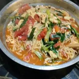 【炒面配料】:细面条,肉丝,扁豆丝,西红柿,葱,蒜 ,醋,酱油,盐,油(建议用粟米油、山茶油或橄榄油)。