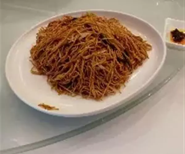 1、将植物油约500ml上锅烧热,将细面条用笊篱下锅炸至金黄,捞出锅沥干油待用;