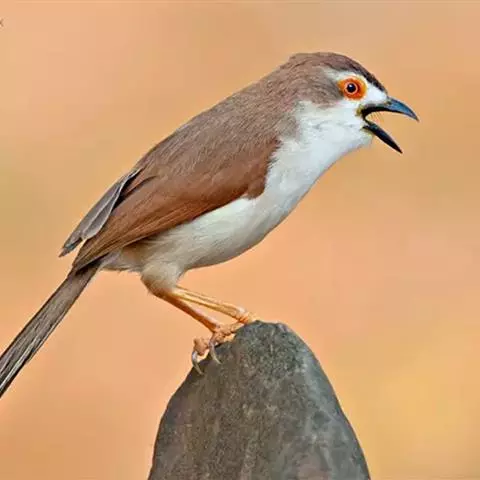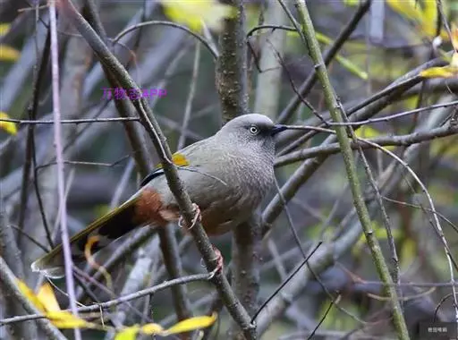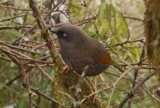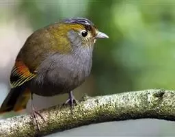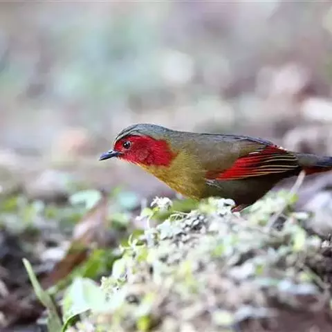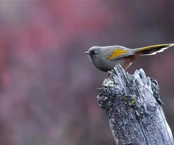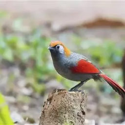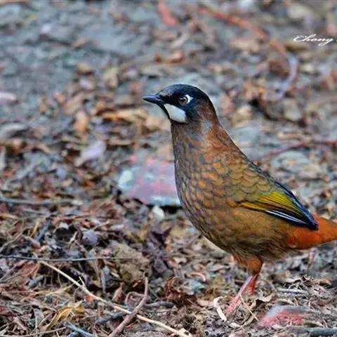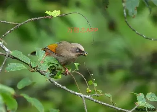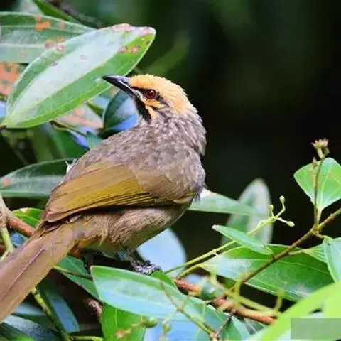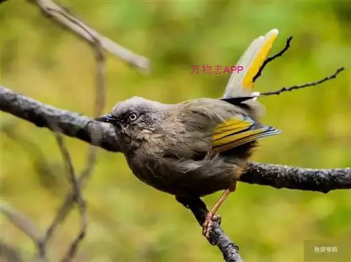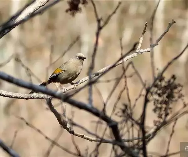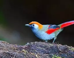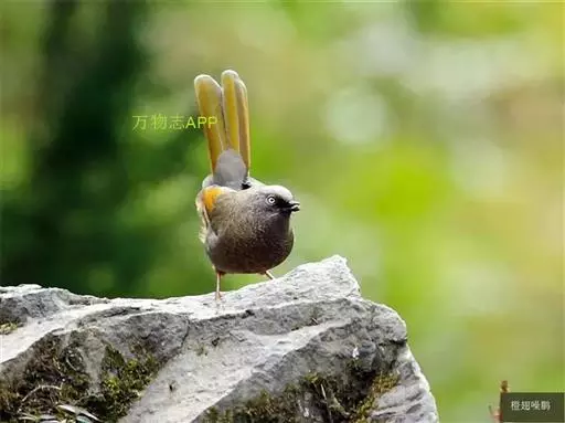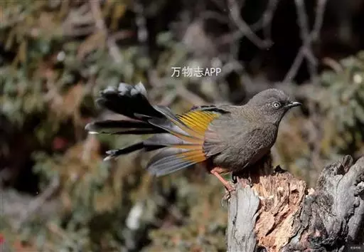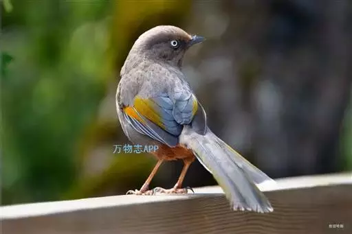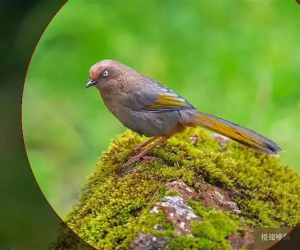 橙翅噪鹛(学名:Garrulax elliotii): 中型鸟类,体长22-25厘米。头顶深葡萄灰色或沙褐色。上体灰橄榄褐色,外侧飞羽外翈蓝灰色、基部橙黄色,中央尾羽灰褐色,外侧尾羽外翈绿色而缘以橙黄色并具白色端斑。喉、胸棕褐色,下腹和尾下覆羽砖红色。
