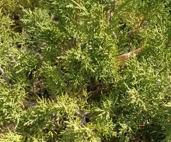 2、金叶桧(cv.Aurea)栽培变种,植株呈直立窄圆锥形灌木状,全为鳞形叶,新生也全部为金黄色。直立灌木,鳞叶初为深金黄色,后渐变为绿色。