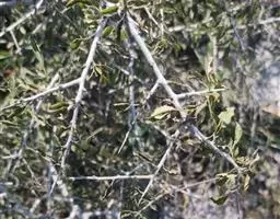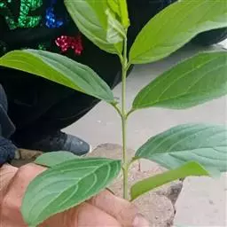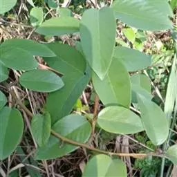 (2)光枝勾儿茶茎呈圆柱形,直径可达1.5cm。表面棕褐色至暗紫色,外被蜡质;质坚硬,难折断,断面不整齐,皮部薄,木部浅黄色,髓明显。叶互生,有短柄,叶片卵圆形,长2-4cm,宽1-2cm,先端渐尖或钝圆,项处有芒尖,全缘;上表面灰绿色,下表面黄绿色,羽状侧脉7-9对;叶近革质。气微、味微苦涩。