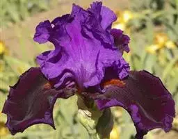 花茎圆柱形,高40-100厘米,实心,有1-3枚茎生叶;苞片3枚,近革质,披针形,长4.5-7.5厘米,宽0.8-1.2厘米,顶端急尖、渐尖或钝,平行脉明显而突出,内包含有2朵花;花深紫色,直径9-10厘米;花梗长1.5-3.5厘米;花被管漏斗形,长1.5-2厘米,外花被裂片倒卵形,长7-8.5厘米,宽3-3.5厘米,爪部细长,中央下陷呈沟状,中脉上有黄色斑纹,内花被裂片小,直立,狭披针形或宽条形,长约5厘米,宽约5-6毫米;雄蕊长约3.5厘米,花药紫色,较花丝长;花柱分枝扁平,长约5厘米,宽0.7-1厘米,紫色,略呈拱形弯曲,顶端裂片三角形,有稀疏的牙齿,子房圆柱形,长1.5-2 厘米,直径约3毫米。