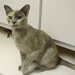 蓝色玳瑁色缅甸猫(被毛呈灰蓝色,花色为乳黄斑) 。