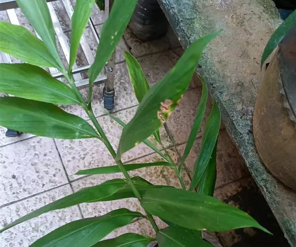 姜叶枯病属真菌性病害,主要为害叶片,病叶上初生黄褐色病斑,逐渐向整个叶片扩展,病部生出黑色小粒点,严重时全叶变褐枯死。
