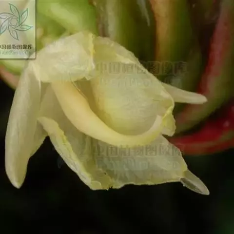 总花梗长达25厘米;穗状花序球果状,长4-5厘米;苞片卵形,长约2.5厘米,淡绿色或边缘淡黄色,顶端有小尖头;花萼管长约1厘米;花冠黄绿色,管长2-2.5厘米,裂片披针形,长不及2厘米;唇瓣中央裂片长圆状倒卵形,短于花冠裂片,有紫色条纹及淡黄色斑点,侧裂片卵形,长约6毫米;雄蕊暗紫色,花药长约9毫米;药隔附属体钻状,长约7毫米。