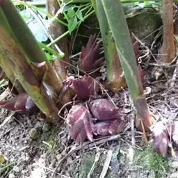 ⒉地下茎。生姜的地下茎称为根茎,既是产品器官,又是繁殖器官。根茎的形成过程是:当种姜发芽出苗后,逐渐长成主茎。随着主茎的生长,主茎基部逐渐膨大,形成一个小根茎,通常称为“姜母”。姜母两侧的腋芽可继续萌发出2-4根姜苗,即一次分枝,其基部逐渐膨大,形成一次姜块,称为子姜。子姜上的侧芽继续萌发,抽生新苗,为第二分枝,其基部膨大形成二次姜块,称为孙姜。如此继续发生第三、第四、第五次姜块,直到收获为止,便形成了一个由姜母和多次子姜组成完整的根茎。在一般情况下,生姜的地上部分分枝越多,地下部分姜块也越多,越大,产量也越高。生姜的叶披针形,互生,叶片下有革质的叶鞘包着茎部,叶片与叶鞘相连处有一孔,新生叶从此孔抽出。