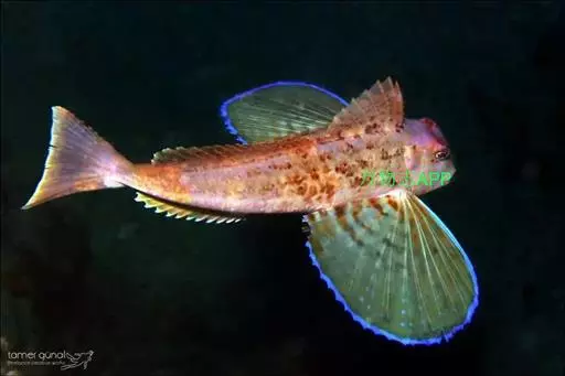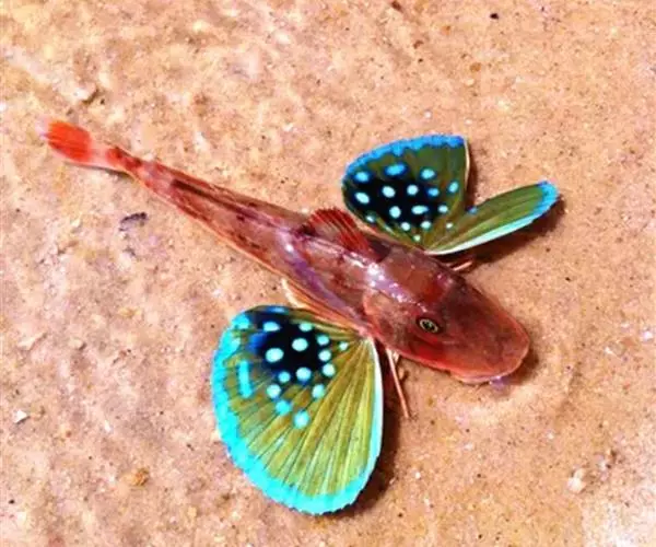 绿鳍鱼(学名:Chelidonichthys kumu),俗称 绿翅鱼、绿姑、鲂鮄、国公鱼、绿莺莺、角鱼、红祥、大头鱼、蜻蜓角。体延长,稍侧扁,前部粗大,后部渐细。一般体长14~30厘米、体重150~300克、头大近方形,吻角钝圆,两颌及犁角具绒毛齿。头部、背面与两侧均被骨板,体被小圆鳞、头部及背侧面红色,并有黄色网状斑纹。背鳍两个,分离。其两侧各有1纵列棘楯板;胸鳍长而宽大、位低,下方有3条指状游离鳍条,内侧为具斑点的艳绿色;尾鳍截形。后缘白色。