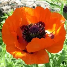 多年生草本,高80-120cm,主根纺锤状,全株具刚毛,茎不分枝。 叶质较厚,叶片不抱茎,卵形至披针形,二回羽状深裂,小裂片具疏齿或缺刻状齿,两面绿色。 花瓣红色或深红色,并有粉色品种,基部有紫色斑块,花丝深紫色。 蒴果近球形,直径2-3.5cm,成熟时苍白色。