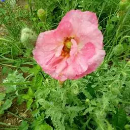 一年生草本,高60-120cm,主根圆锥状,全株无毛或具少数刚毛,茎不分枝。 叶质较厚,茎生叶抱茎,叶片卵形或长卵形,叶缘为不规则的浅波锯齿,两面无毛,具白粉。 花瓣红色、粉色、紫色、白色或杂色,花瓣边缘浅波状或有各式分裂,花丝白色。 蒴果球形或长圆状椭圆形,直径4-5cm,成熟时褐色。