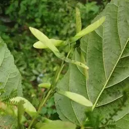 性状鉴别:为单粒种子的果实,果皮一端向外延伸成翅状,平展,类匙形,长25-30mm,宽6-10mm,黄褐色或淡棕色,偶见2个带翅果实并排于一纤细果柄上,张开成钝角,形似蝴蝶的翅膀。小坚果凸起,卵形,直径约4mm。破碎后气微,味微苦涩。