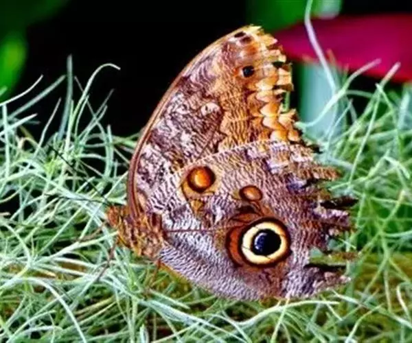 猫头鹰蝶是举世闻名的常见大型蝶类。整个翅面酷似猫头鹰的脸,是极其巧妙的伪装。猫头鹰蝶的名字来源于其翅膀上的图案,在下层两侧翅膀上,一对和猫头鹰眼睛一样的图案,看起来像凶神恶煞。其实它的功能在欺骗捕食者,让对方误认为正有一只大眼睛动物在凶狠地瞪着,这种伪装也是防止受到它的天敌——癞蛤蟆的攻击,是一种很明显的警戒色。