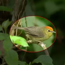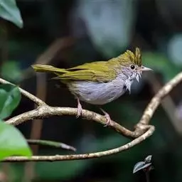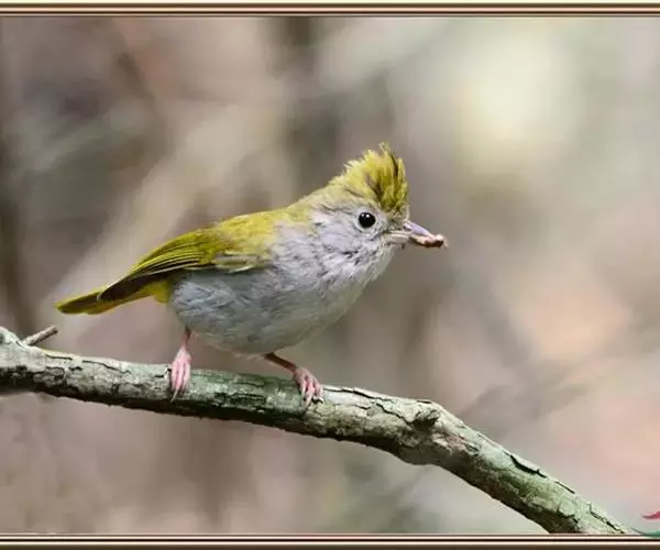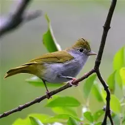 体小(13厘米)的橄榄绿色凤鹛。下体灰白,尾下覆羽黄色,冠羽凸显。与色彩相似的莺类的区别在具羽冠。