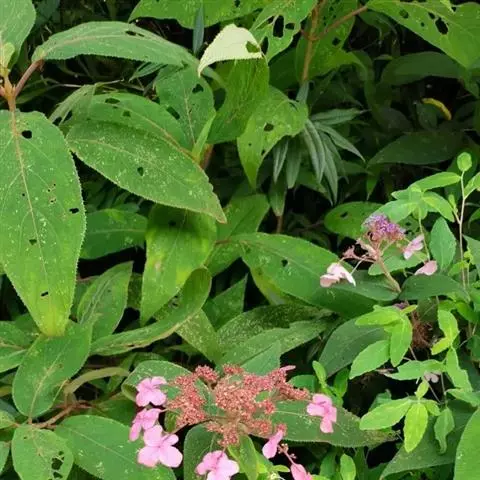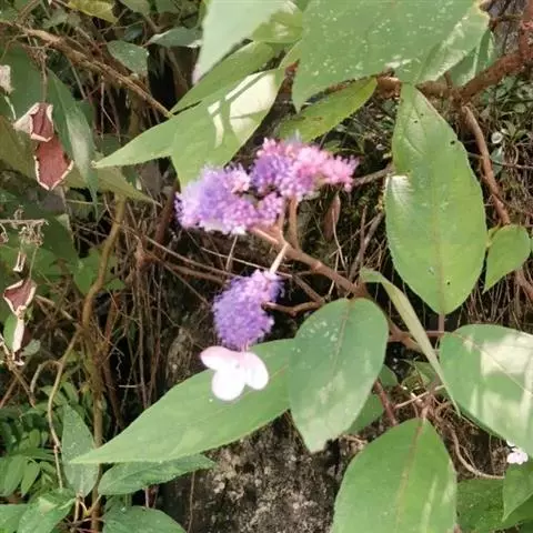 圆锥绣球,虎耳草科挂苦子组灌木或小乔木,枝暗红褐色或灰褐色,初时被疏柔毛,后变无毛,具凹条纹和圆形浅色皮孔。生长于山谷、山坡疏林下或山脊灌丛中。