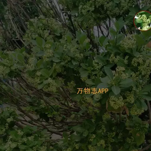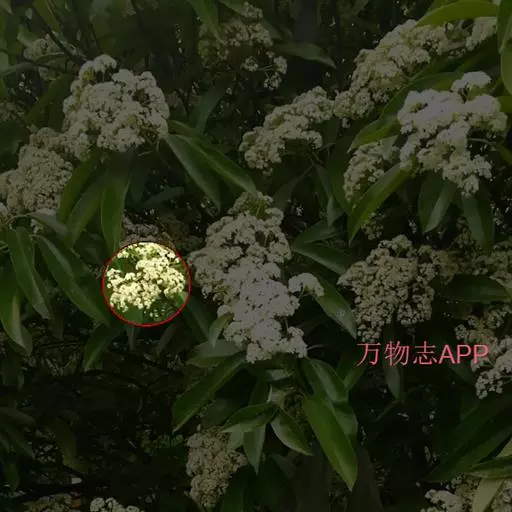 圆锥状聚伞花序尖塔形,长达26厘米,序轴及分枝密被短柔毛;不育花较多,白色;萼片4,阔椭圆形或近圆形,不等大,结果时长1-1.8厘米,宽0.8-1.4厘米,先端圆或微凹,全缘;孕性花萼筒陀螺状,长约1.1毫米,萼齿短三角形,长约1毫米,花瓣白色,卵形或卵状披针形,长2.5-3毫米,渐尖;雄蕊不等长,长的长达4.5毫米,短的略短于花瓣,花药近圆形,长约0.5毫米;子房半下位,花柱3,钻状,长约1毫米,直,基部连合,柱头小,头状。