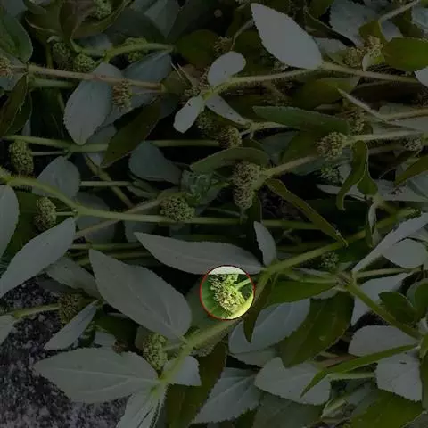 叶纸质,2-3片对生或轮生,卵形或椭圆形,长5-14厘米,宽2-6.5厘米,先端渐尖或急尖,具短尖头,基部圆形或阔楔形,边缘有密集稍内弯的小锯齿,上面无毛或有稀疏糙伏毛,下面于叶脉和侧脉上被紧贴长柔毛;侧脉6-7对,上部微弯,小脉稠密网状,下面明显;叶柄长1-3厘米。