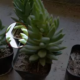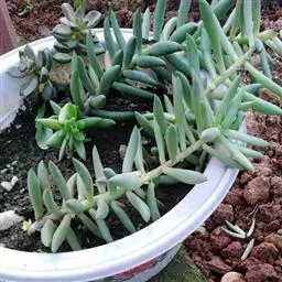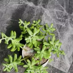 玉米石,为多年生草本肉质植物,植株低矮丛生,植株可长到0.1-0.5米。叶片膨大为卵形或圆筒形,互生,长0.6-1.2cm,先端钝圆,亮绿色,光滑。伞形花序下垂,花白色。栽培品种有其他花色。