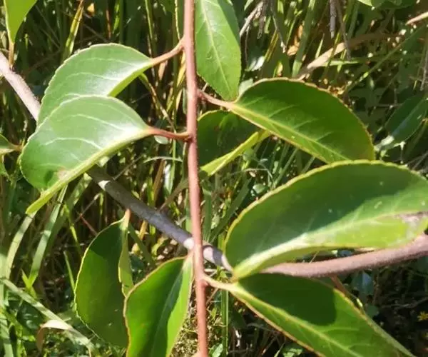 常绿藤本,幼枝褐色,或红棕色,有时被柔毛,小枝无毛,皮孔圆形,稀疏或密布,髓实心,白色;冬芽圆锥形,长2.5毫米,最外两枚芽鳞片特化成三角形刺,以后增大,长可达5毫米。叶片近革质,椭圆形或宽卵状椭圆形,先端急尖,基部楔形或圆形,边缘具疏细锯齿,近基部全缘,侧脉4~5对,网脉不明显,无毛,叶柄长6-2毫米。