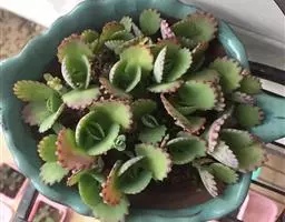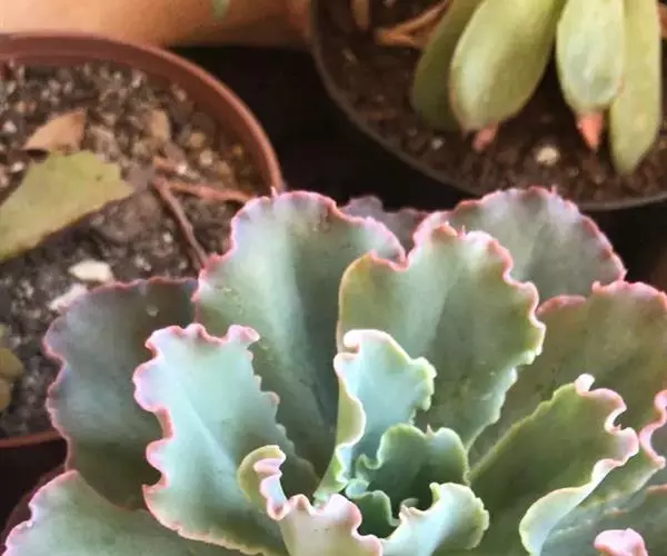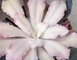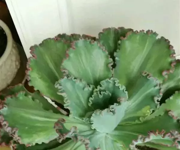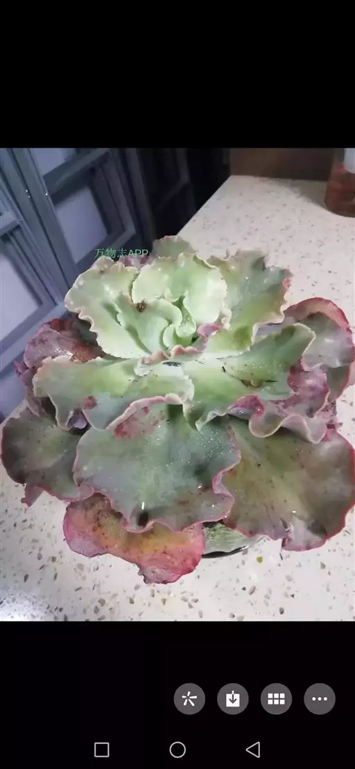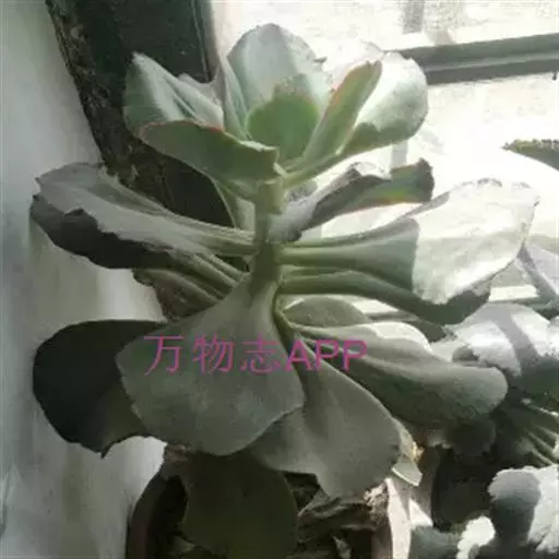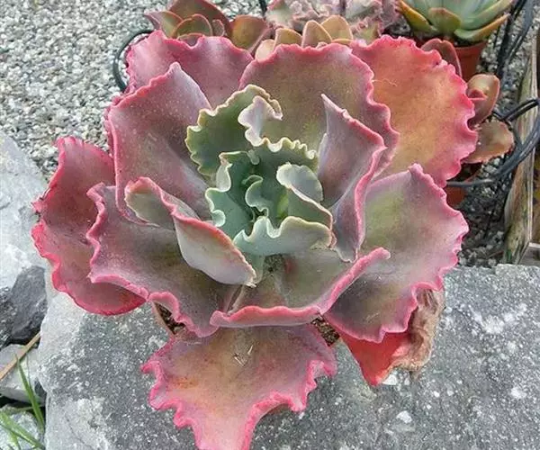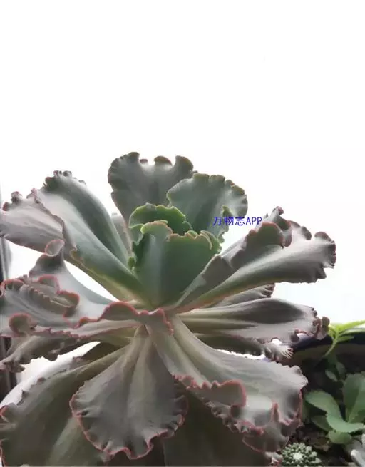 叶色翠绿至红褐,新叶色浅、老叶色深,强光与昼夜温差大或冬季低温期叶色深红,弱光则叶色浅绿,叶缘呈大波浪状,常会显现紫红色。新叶有薄霜粉覆盖。 偶有侧芽。聚伞花序,长50~100厘米,花通常呈粉色。 [1-2]