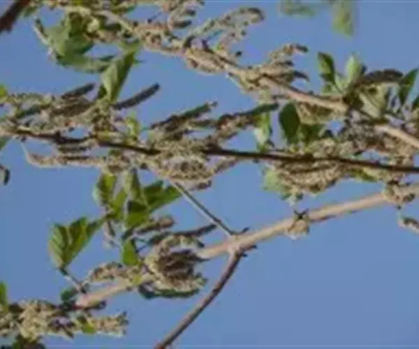 毛白杨器官特写 乔木,高达30米。树皮幼时暗灰色,壮时灰绿色,渐变为灰白色,老时基部黑灰色,纵裂,粗糙,干直或微弯,皮孔菱形散生,或2-4连生;树冠圆锥形至卵圆形或圆形。侧枝开展,雄株斜上,老树枝下垂;小枝(嫩枝)初被灰毡毛,后光滑。芽卵形,花芽卵圆形或近球形,微被毡毛。长枝叶阔卵形或三角状卵形,长10-15厘米,宽8-13厘米,先端短渐尖,基部心形或截形,边缘深齿牙缘或波状齿牙缘,上面暗绿色,光滑,下面密生毡毛,后渐脱落;叶柄上部侧扁,长3-7厘米,顶端通常有2(3-4)腺点;短枝叶通常较小,长7-11厘米,宽6.5-10.5厘米(有时长达18厘米,宽15厘米),卵形或三角状卵形,先端渐尖,上面暗绿色有金属光泽,下面光滑,具深波状齿牙缘;叶柄稍短于叶片,侧扁,先端无腺点。雄花序长10-14(20)厘米,雄花苞片约具10个尖头,密生长毛,雄蕊6-12,花药红色;雌花序长4-7厘米,苞片褐色,尖裂,沿边缘有长毛;子房长椭圆形,柱头2裂,粉红色。果序长达14厘米;蒴果圆锥形或长卵形,2瓣裂。花期3月,果期4月(河南、陕西)-5月(河北、山东)。