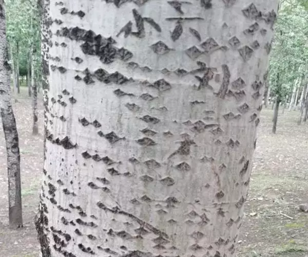 毛白杨破腹病主要发生在树干基部和中部,纵裂长度不一,自数厘米至数米,宽度1~3cm,露出木质部,裂缝初形成时,表现为机械伤。春季三月份树木萌动后,逐渐产生愈合组织,但多数不能完全愈合。当树液流动时,树液不断从伤口流出,逐渐变为红褐色粘液,并有异臭。破腹病常常引起毛白杨红心。这种现象发生在已是裂缝的组织上时,裂缝就向内及上下延伸。毛白杨红心病是由伤口直接诱发的一种生理病变,木质部变色是一系列生理生化反应的结果。