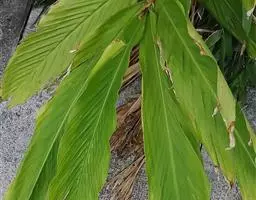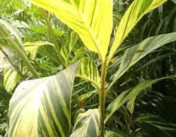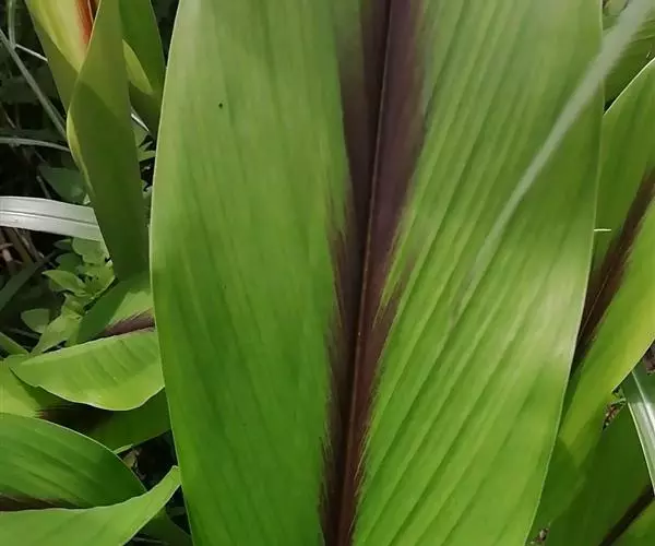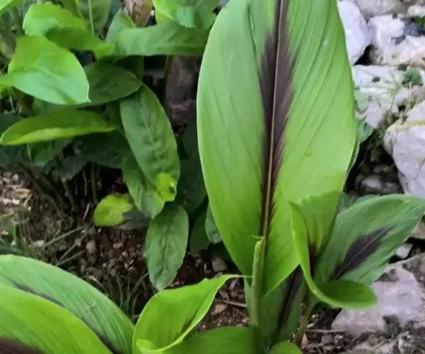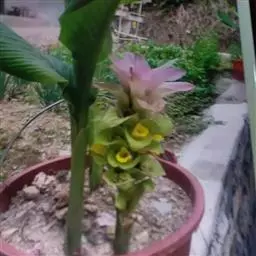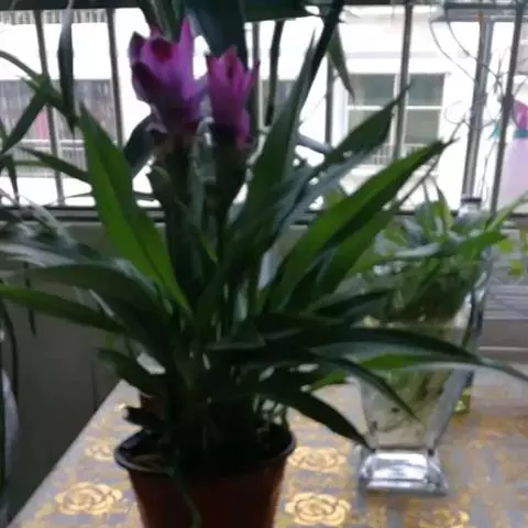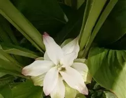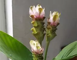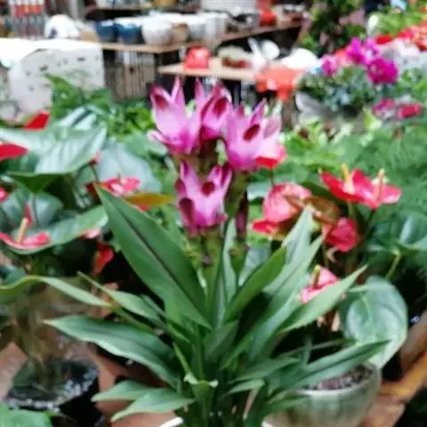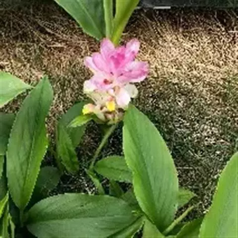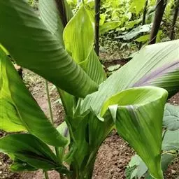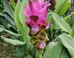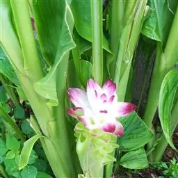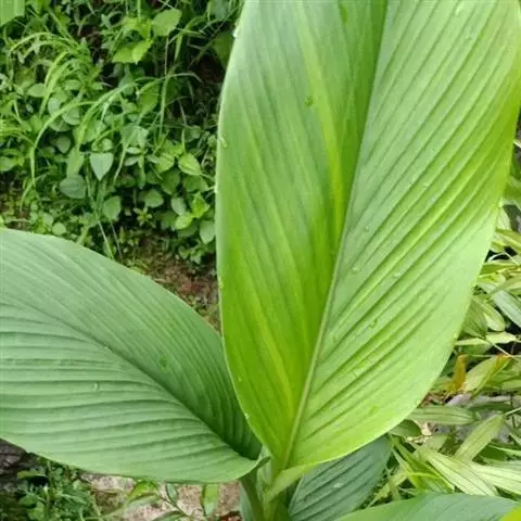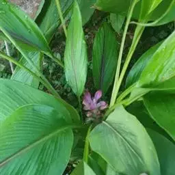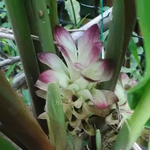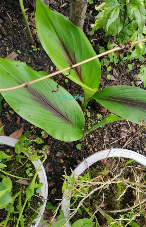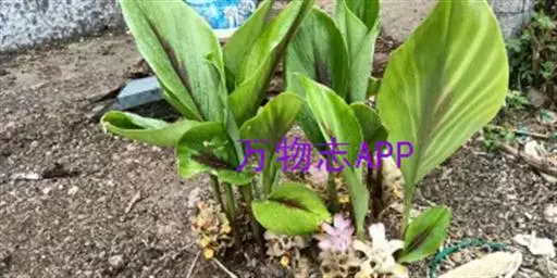 株高约1米;根茎圆柱形,肉质,具樟脑般香味,淡黄色 莪术花 或白色;根细长或末端膨大成块根。叶直立,椭圆状长圆形至长圆状披针形,长25-35(60)厘米,宽10-15厘米,中部常有紫斑,无毛;叶柄较叶片为长。