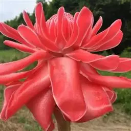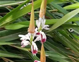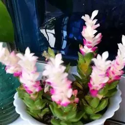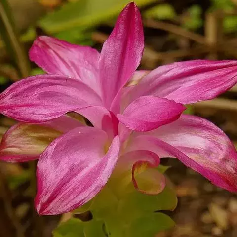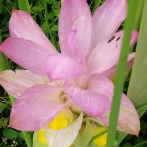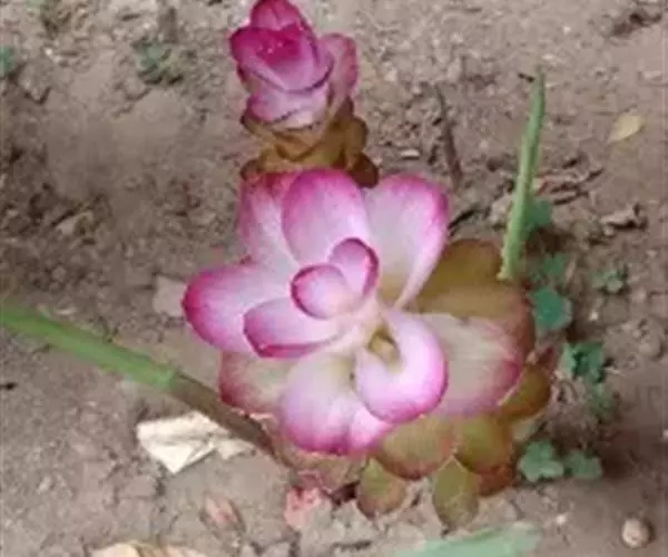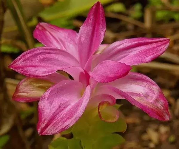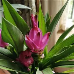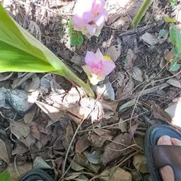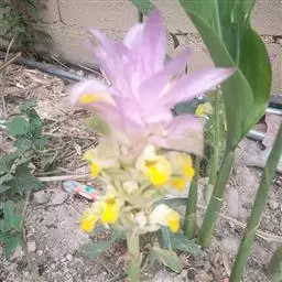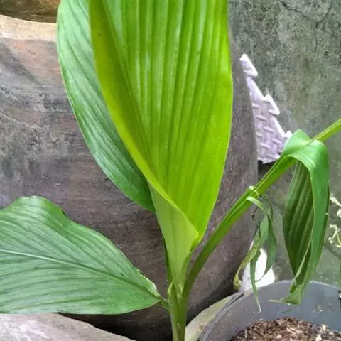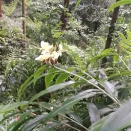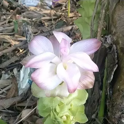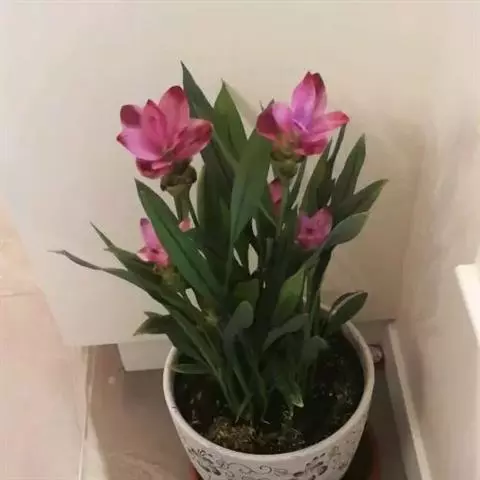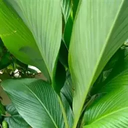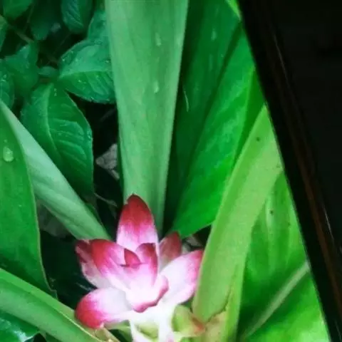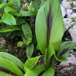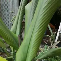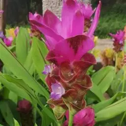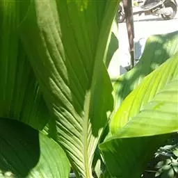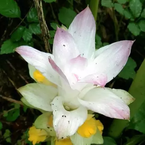 株高约1米;根茎圆柱形,肉质,具樟脑般香味,淡黄色 莪术花 或白色;根细长或末端膨大成块根。叶直立,椭圆状长圆形至长圆状披针形,长25-35(60)厘米,宽10-15厘米,中部常有紫斑,无毛;叶柄较叶片为长。