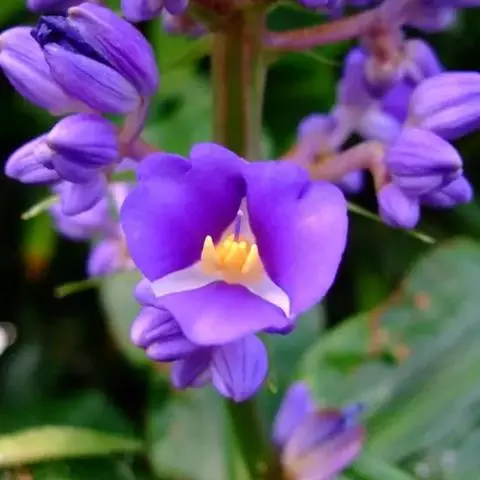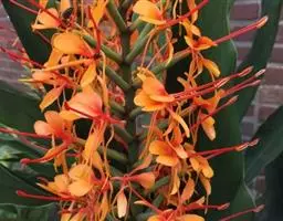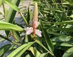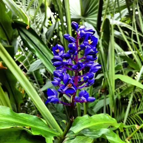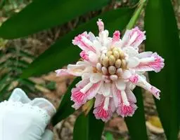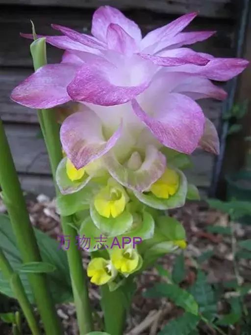 花葶由根茎单独发出,常先叶而生,长10-20厘米,被疏松、细长的鳞片状鞘数枚;穗状花序阔椭圆形,长10-18厘米,宽5-8厘米;苞片卵形至倒卵形,稍开展,顶端钝,下部的绿色,顶端红色,上部的较长而紫色;花萼长1-1.2厘米,白色,顶端3裂;花冠管长2-2.5厘米,裂片长圆形,黄色,不相等,后方的1片较大,长1.5-2厘米,顶端具小尖头;侧生退化雄蕊比唇瓣小;唇瓣黄色,近倒卵形,长约2厘米,宽1.2-1.5厘米,顶端微缺;花药长约4毫米,药隔基部具叉开的距;子房无毛。花期:4-6月。