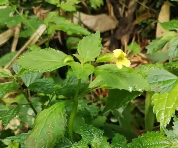 四川沟酸浆顶端尖,茎部宽楔形,渐狭成1.5厘米的短柄,缘有疏齿,羽状脉,主要功效能清热解毒,利湿,消肿,止血。