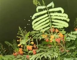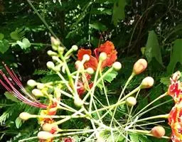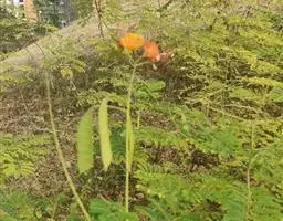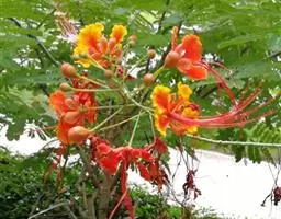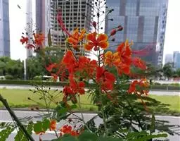 洋金凤 Sw.),豆科小凤花属灌木状或小乔木植物,枝无毛,绿或粉绿色;二回羽状复叶;总状花序伞房状,…