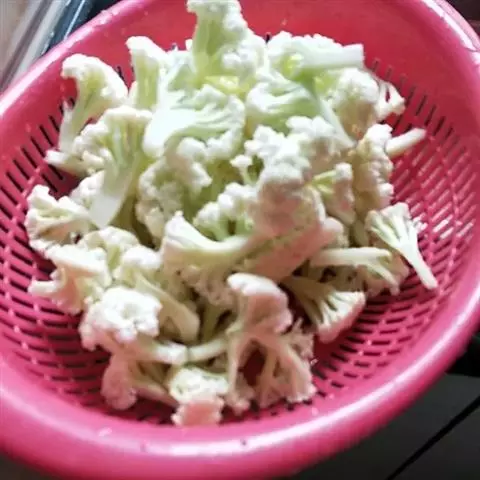 2、菜花倒入烧开的沸水中抄一下,捞出沥干备用;