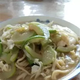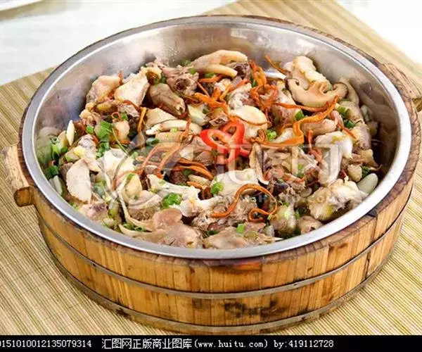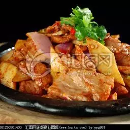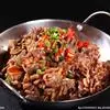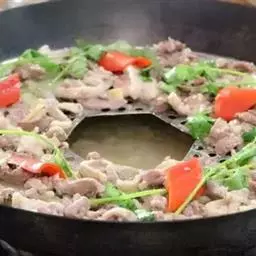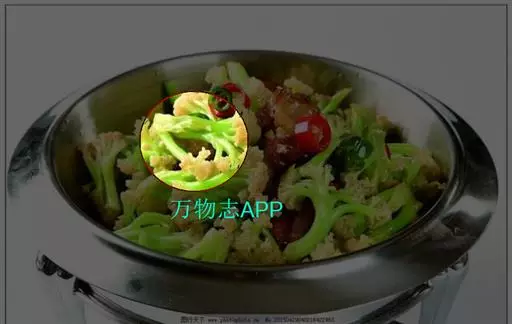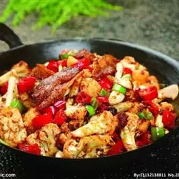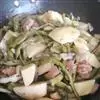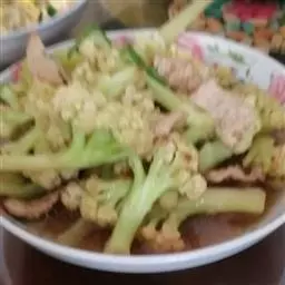 4、然后倒入菜花、高汤翻炒均匀,可少许加上肉片,再加上少许清水,煮8分钟左右;
