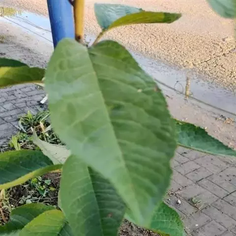 叶片长圆倒卵形、长椭圆形,稀长圆卵形,长6-8(-12)厘米,宽3-5厘米,先端渐尖、急尖或短尾尖,基部楔形,边缘有圆钝重锯齿,常混有单锯齿,幼时齿尖带腺,上面深绿色,有光泽,侧脉6-10对,不达到叶片边缘,与主脉成45°角,两面均无毛,有时下面沿主脉有稀疏柔毛或脉腋有髯毛;托叶膜质,线形,先端渐尖,边缘有腺,早落;叶柄长1-2厘米,通常无毛,顶端有2个腺体或无,有时在叶片基部边缘有腺体。