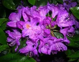大钟杜鹃(学名:Rhododendron ririei Hemsl. et Wils.):常绿灌木或小乔木,高约2-5米;树皮淡灰色或灰棕色,有裂纹及层状剥落;幼枝粗壮,嫩绿色,无毛。叶革质,常3-5枚密生于枝顶,叶片长圆状椭圆形或倒卵状椭圆形,上面深绿色,无毛,下面有银白色紧贴的薄层毛被。顶生总状伞形花序,有花5-10朵;花冠钟状,基部宽阔,紫红色,长4-6厘米,口部直径5-6厘米,基部直径1.2-1.5厘米,有5个紫红色蜜腺囊,5裂,裂片近于圆形。蒴果圆柱形,初被白毛,以后无毛,10室。花期3-5月,果期6-10月。