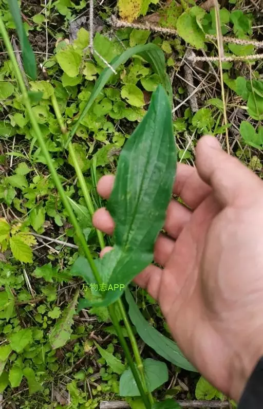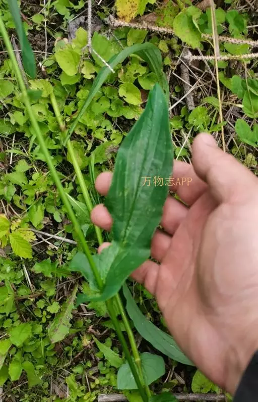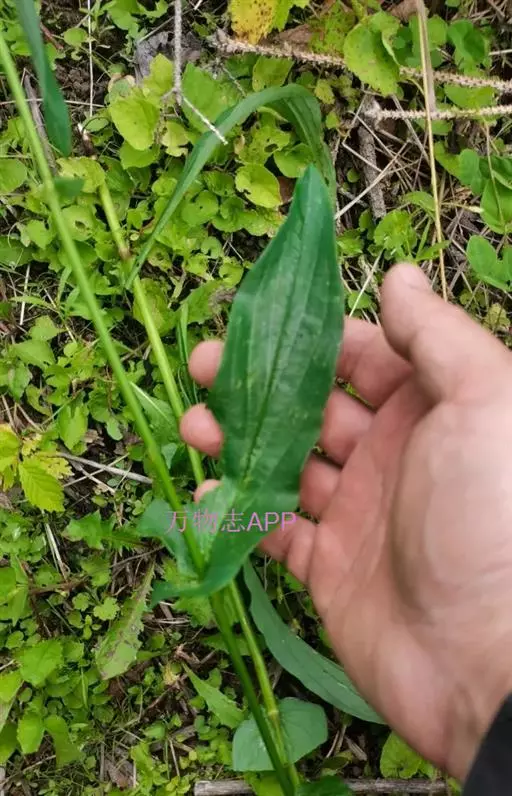 叶大形,稍稀疏,表面鲜绿色,背面带粉兰绿色,基生叶广卵形到椭圆形或披针形,顶端急尖或渐尖,下部楔形或广楔形,并收缩成宽扁有翼的长叶柄,至基部又扩大成叶鞘抱茎,叶片长8-17厘米,宽2.5-5(8)厘米,9-11脉;叶柄常带紫色,长8-12厘米;茎中部叶无柄,卵形或狭卵形,7-9脉;茎上部叶渐小,卵形或广披针形,9-11脉,顶端渐尖,基部心形,抱茎。