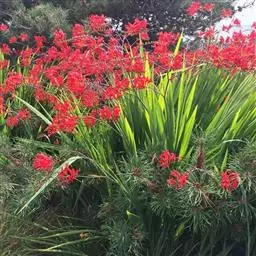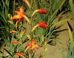 又名红花香雪兰、长梗雪香兰。叶长40~60cm,花茎强壮多分枝,植株高50cm;花筒部白色,喉部橘红色,花被片的边缘粉紫色;花期较迟。