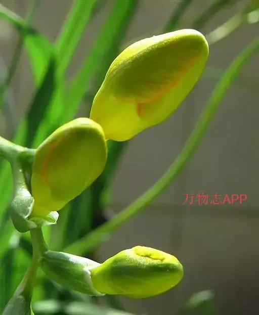 鹅黄小苍兰(var.Leichlinii):叶阔披针形,4~5枚,长约15cm,宽1.5cm,基部呈白色膜质的叶鞘,花宽短呈钟状,有铃兰般的香气,花大,鲜黄色,花被片边缘及喉部带橙红色,一穗有花3~7朵。
