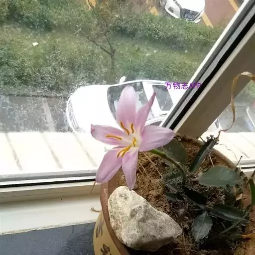 花单生于花茎顶端,下有佛焰苞状总苞,总苞片常带淡紫红色,长4-5cm,下部合生成管;花梗长2-3cm;花玫瑰红色或粉红色;花被管长1-2.5cm,花被裂6片,裂片倒卵形,顶端略尖,长3-6cm;雄蕊6,长约为花被的2/3-4/5,花药丁字形着生;子房下位,3室,胚珠多数,花柱细长,柱头深3裂。蒴果近球形;种子黑色。花期春夏秋。