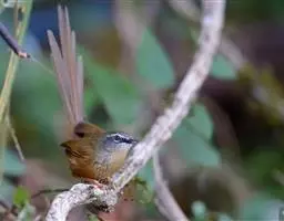 黑喉山鹪莺:体长16厘米,是一种长尾的褐色鹪莺。具明显的白色眉纹及形长的尾。特征为胸具黑色纵纹。…