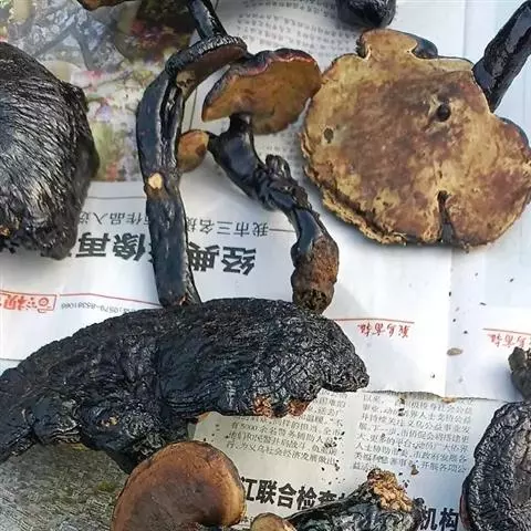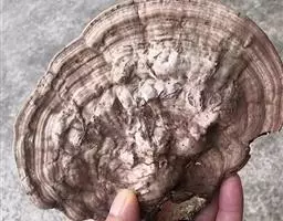 本品为不规则的块状,直径2~7cm,厚0.2~1.5cm。外皮暗褐色,有皱纹及须根痕。切面类白色或灰白色,可见筋脉纹(维管束),有的略呈环状排列。质硬而脆,易折断,断面显粉性。