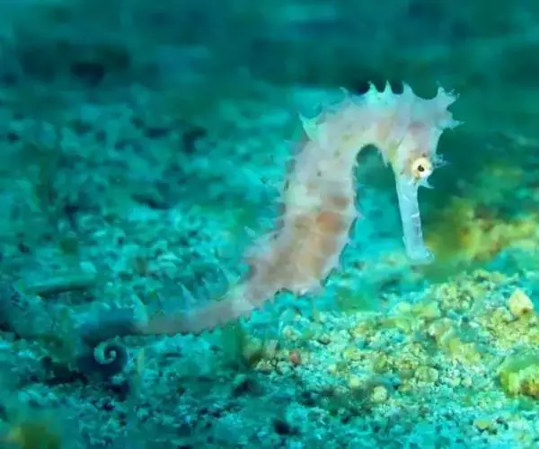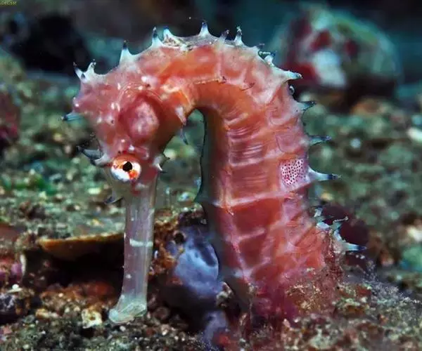 大海马体形粗壮,体长12一23.5cm,腹部较膨大、头较大,近似直角。小棘发达,吻呈管状较粗大,体色较黑。