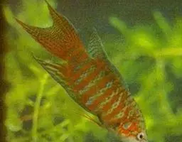 叉尾斗鱼,体形与圆尾斗鱼相似。腹鳍有1根分节鳍条特别延长,雄鱼鳍条延长尤甚,尾鳍叉形。…