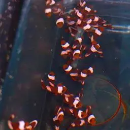 番茄小丑鱼 人工小丑鱼在繁殖场刚繁殖出来时是在裸缸内饲养的,头几天喂轮虫,以后喂丰年虫,大约一个半月左右,当人工小丑鱼长到1.5cm 以上并开始在缸底睡觉时,开始进行驯化,驯化的食物为颗粒料、碎虾肉及螺旋藻,十到十五天左右鱼一听到水声响就全部过来吃食时就可出售了。