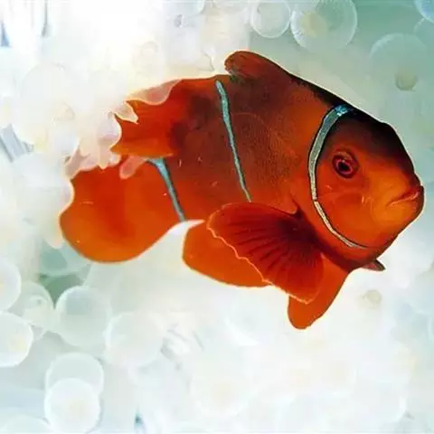分布于印度洋、太平洋的珊瑚礁海域和台湾、中国南海及菲律宾等地,属雀鲷科,体长10~12cm,椭圆形。全身鲜红色,体侧在眼睛后、背鳍中间、有两条银白色环带。双带小丑的体色 红双带小丑鱼图片 多变,有鲜红、紫红、紫黑等,饲养水温26~27℃,海水比重1.022~1.023,海水ph值8.0~8.5之间,水硬度7~9度dh。饵料有海水鱼颗粒饲料、切碎的鱼肉、海藻等。水质要求澄清,喜欢躲在多彩的海葵中。