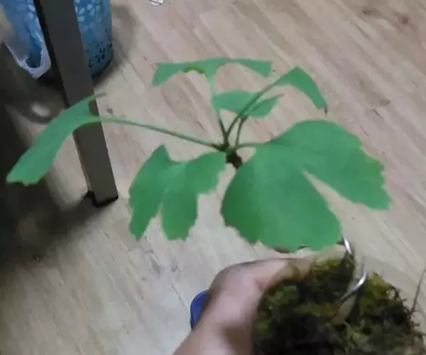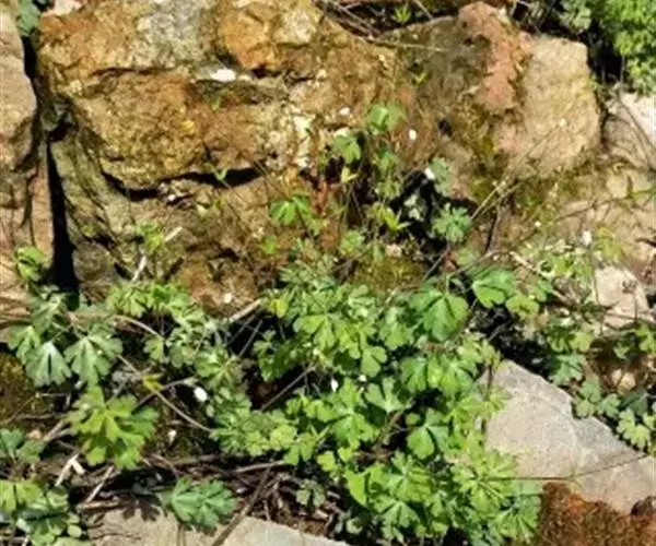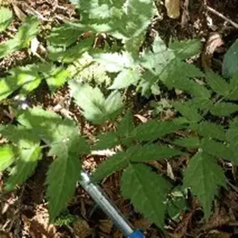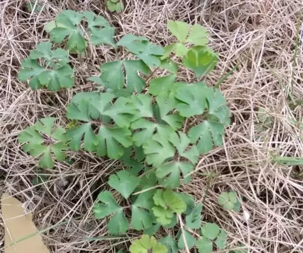 基生叶多数,为掌状三出复叶;叶片轮廓卵圆形至肾形,长1.2-3厘米;小叶扇状菱形或倒卵状菱形,长0.6-2.5厘米,宽1-2.8厘米,三深裂,深裂片又有2-3个小裂片,两面均无毛;叶柄长3-12厘米,基部扩大呈鞘状。茎生叶与基生叶相似,惟较小。