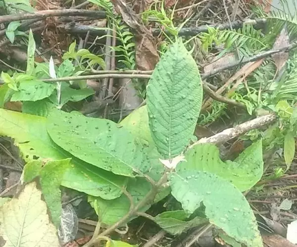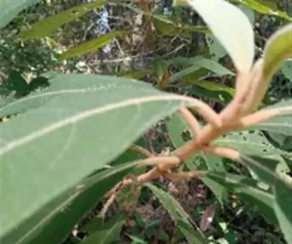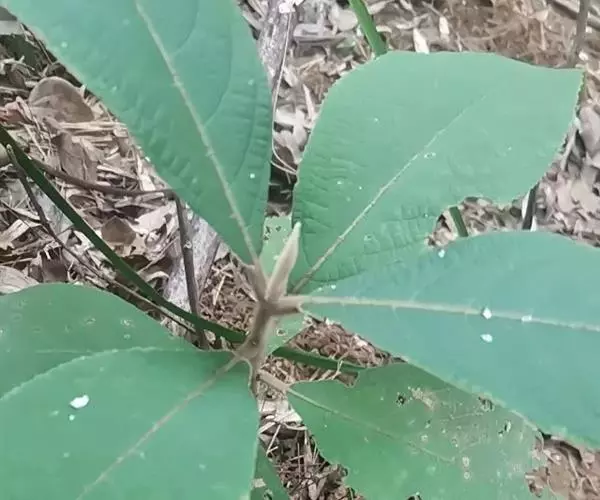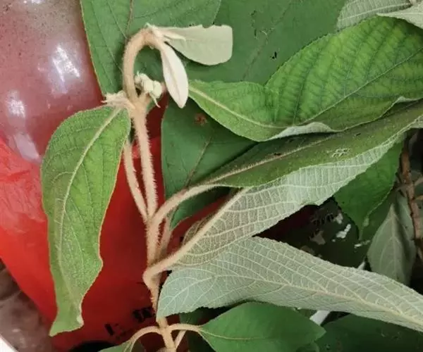 叶片长椭圆形、卵状椭圆形或长椭圆状披针形,长12-22厘米,宽4-8厘米,顶端渐尖或锐尖,基部楔形,边缘有锯齿,表面无毛或疏被毛,通常脉上较密,背面密生黄褐色星状毛和分枝茸毛,两面被不明显的黄色腺点,侧脉10-18对,在叶背隆起;叶柄长1-3厘米。