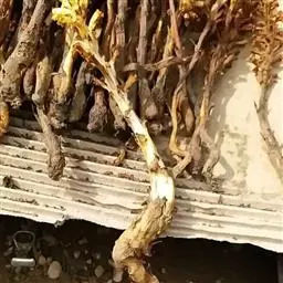 4. 根腐病 该病主要侵染根系,发病初期根尖或幼根呈褐色水渍状,以后变成黑褐色坏死病斑,逐渐发展使主根呈锈黄色坏死病斑,最后仅剩下纤维状纤维束,病株极易从土中拔起。空气潮湿时,在根茎表面产生白色霉层。发病植株随病害发展至叶片,由外向里逐渐变黄坏死,最后全株枯死。土壤温度低、湿度大有利于发病。