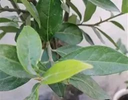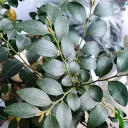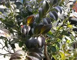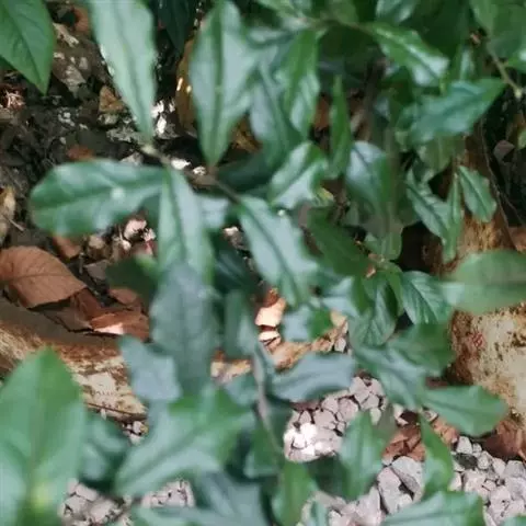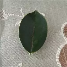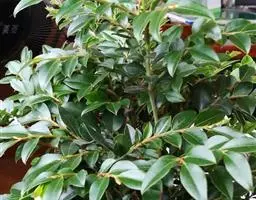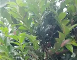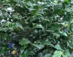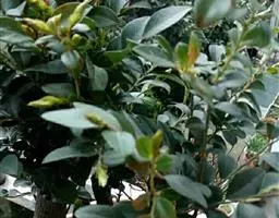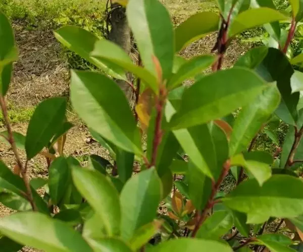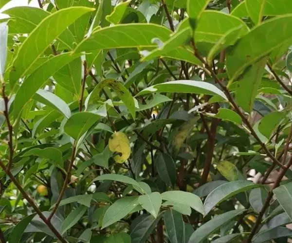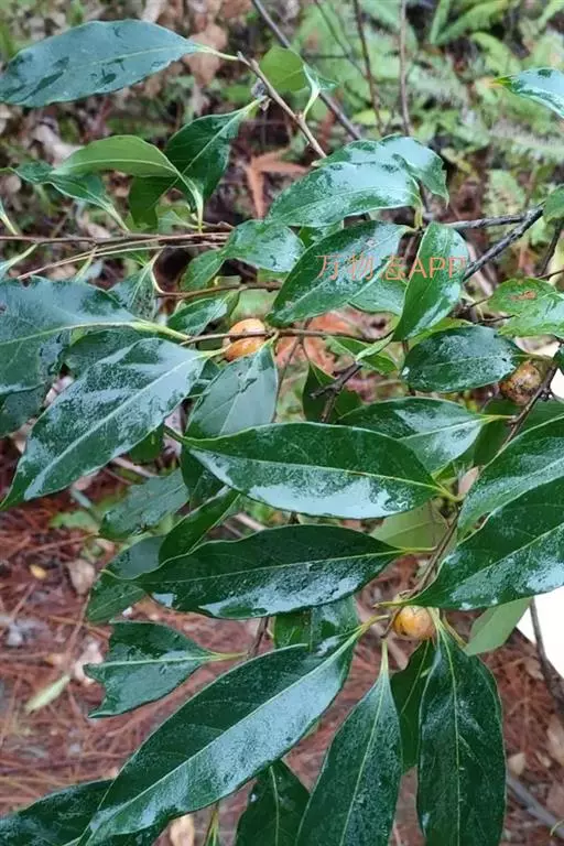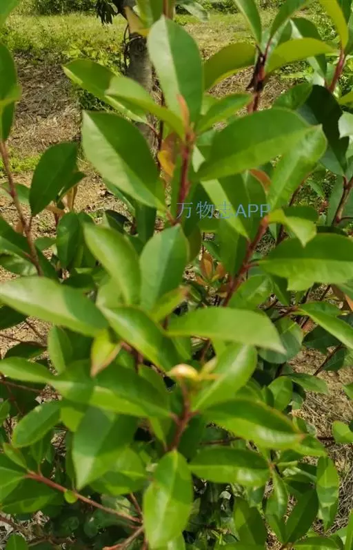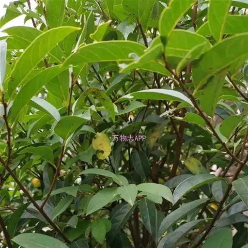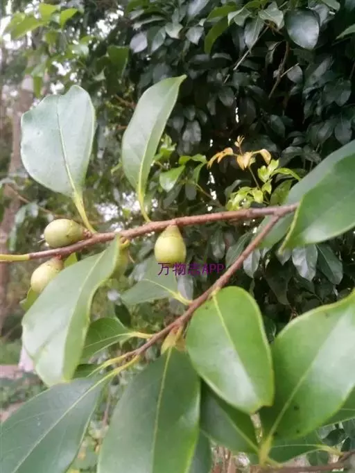 叶薄革质,长椭圆形或下部的为卵形,长5-10厘米,宽2.5-4厘米,先端短渐尖或钝,基部楔形,叶缘微背卷,上面有光泽,深绿色,下面绿色,干时上面常呈灰褐色,下面常变为棕褐色,中脉上面平坦,下面凸起,侧脉纤细,每边4-6条,上面略明显,下面稍凸起,在老叶上的有时上面微凹下,斜向上生,梢端网结,小脉很纤细,结成疏网状,不明晰;叶柄长约1厘米,嫩时疏被短柔毛,先端有很狭的翅。