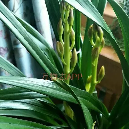建兰(学名:Cymbidium ensifolium (L. ) Sw.):地生植物;假鳞茎卵球形,包藏于叶基之内。叶2--6枚,带形,有光泽,长30-60厘米,宽1-2.5厘米。花葶从假鳞茎基部发出,直立,一般短于叶;总状花序具3-9朵花;花常有香气,色泽变化较大,通常为浅黄绿色而具紫斑;萼片近狭长圆形或狭椭圆形;花瓣狭椭圆形或狭卵状椭圆形,长1.5-2.4厘米,宽5-8毫米,近平展;唇瓣近卵形,长1.5-2.3厘米,略3裂。蒴果狭椭圆形,长5-6厘米,宽约2厘米。花期通常为6-10月。
